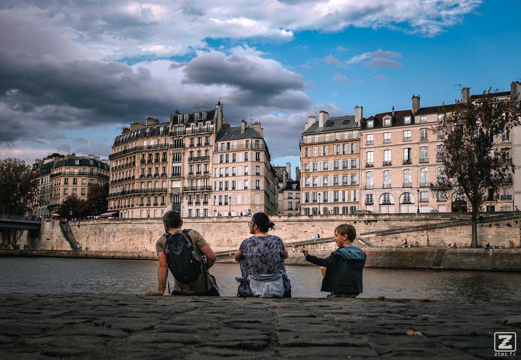 3 person sited on the river border. The river is the Seine in Paris. We can see the typical Parisian building on the other side of the river.