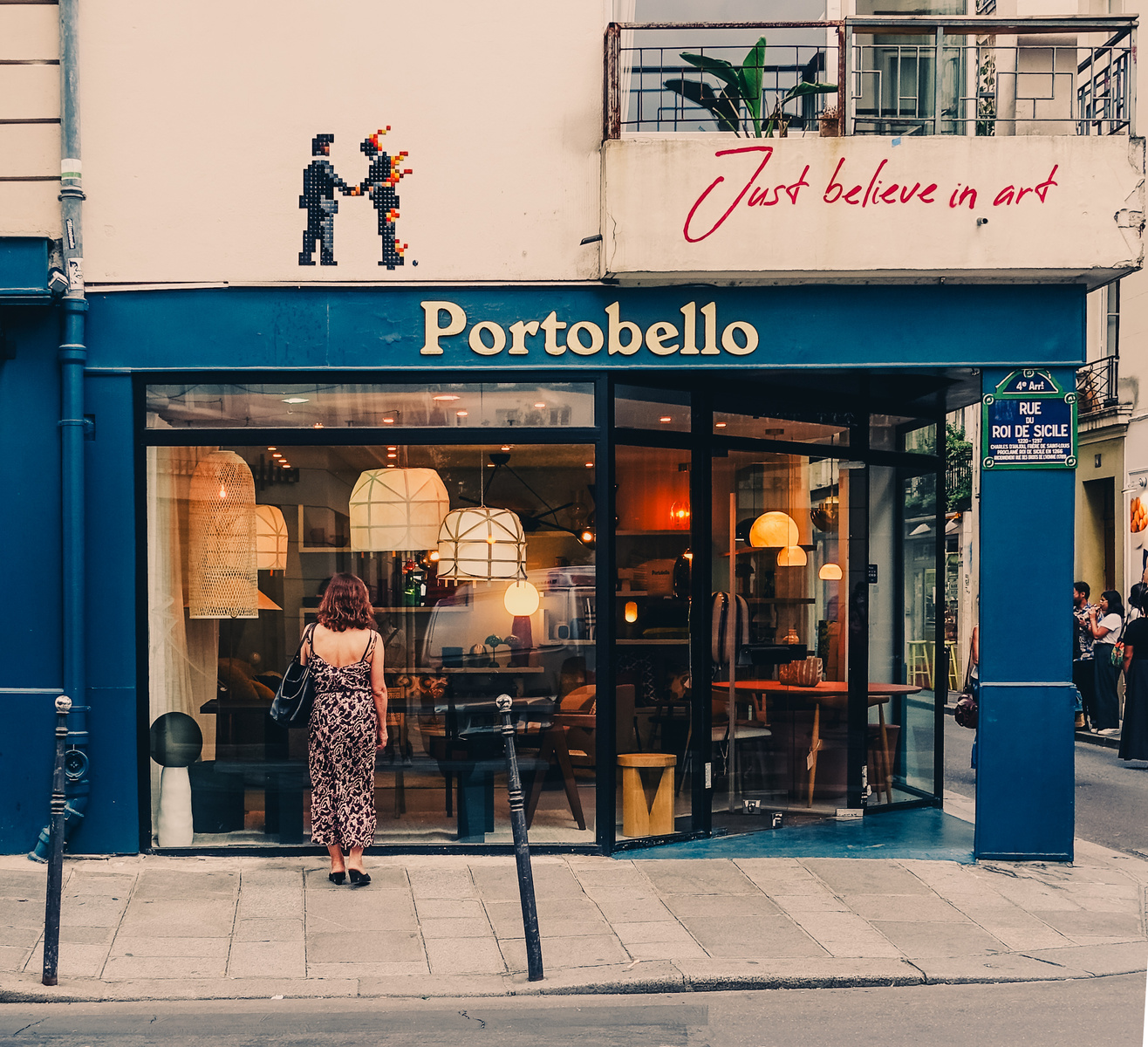 | Description | A girl is looking into the window of a store. There is design furniture in the store. The store is names "Portobello" Right above the store, a Mosaic display two man shaking hand, one is in fire (pink Floyd cover?). Right to it, in a different style, is written "Just believe in art". | |