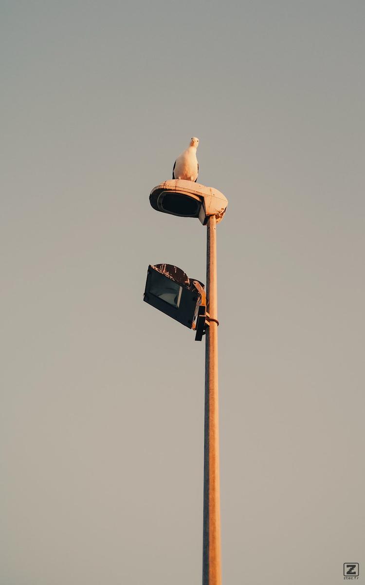 | Description | A seagull "watching" at the camera from the top of a pole light | |