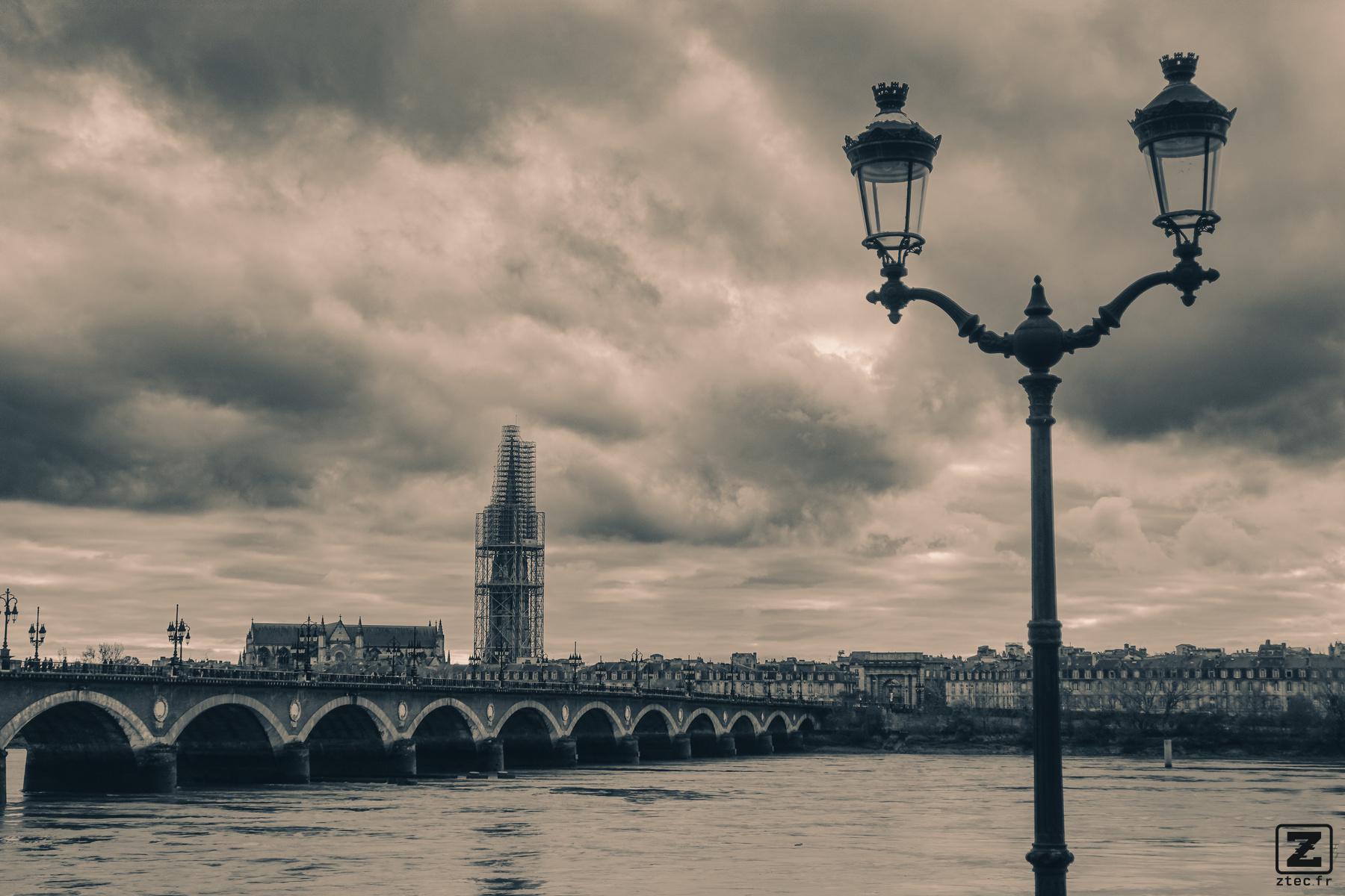 A stone bridge called Pont de Pierre crossing the Garonne in Bordeaux. You can see a twin public light on the right. On the background, you can see a tower surrounded by scaffolding for repair.