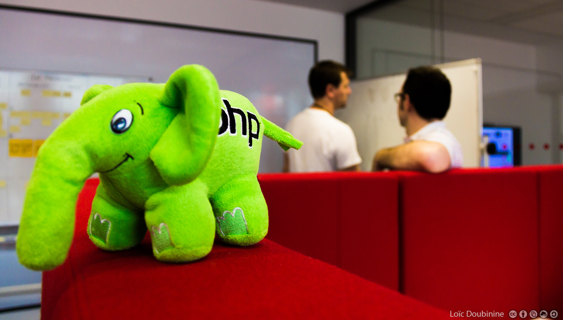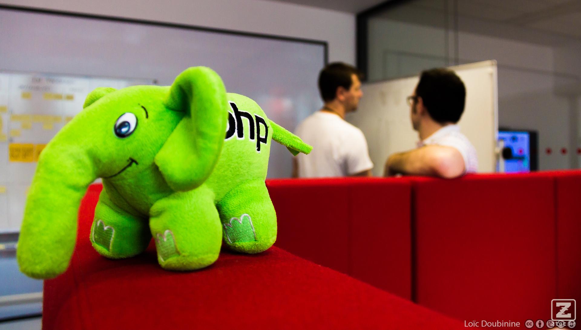 | Description | Workers too busy to see the green elePHPant walking on this strange red stuf ! | |
