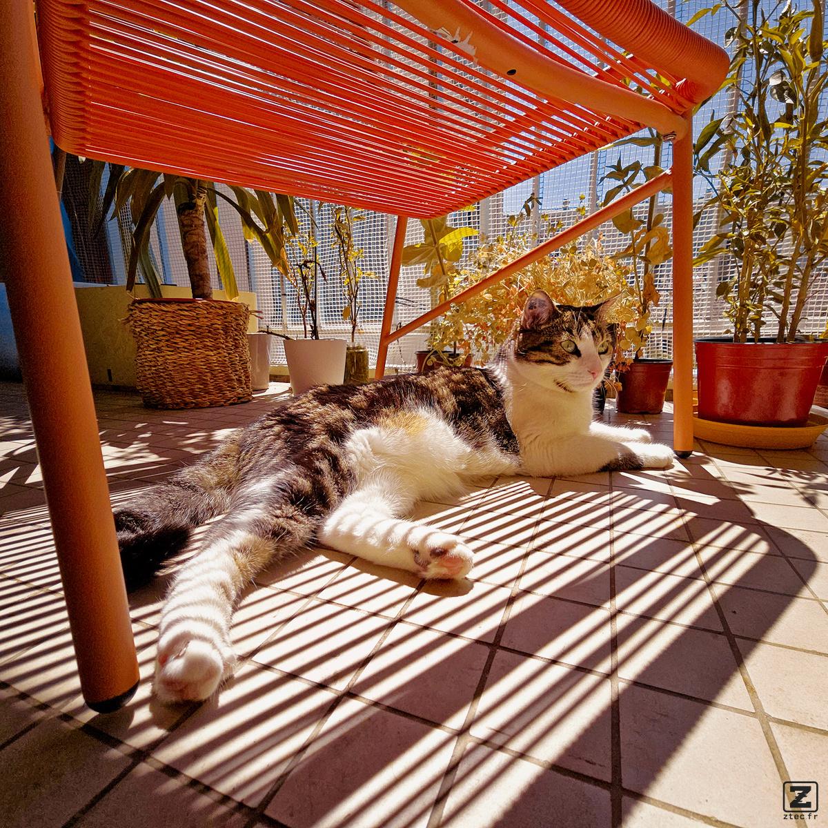 | Description | Cat taking a sun bath on balcony under a chair | |
