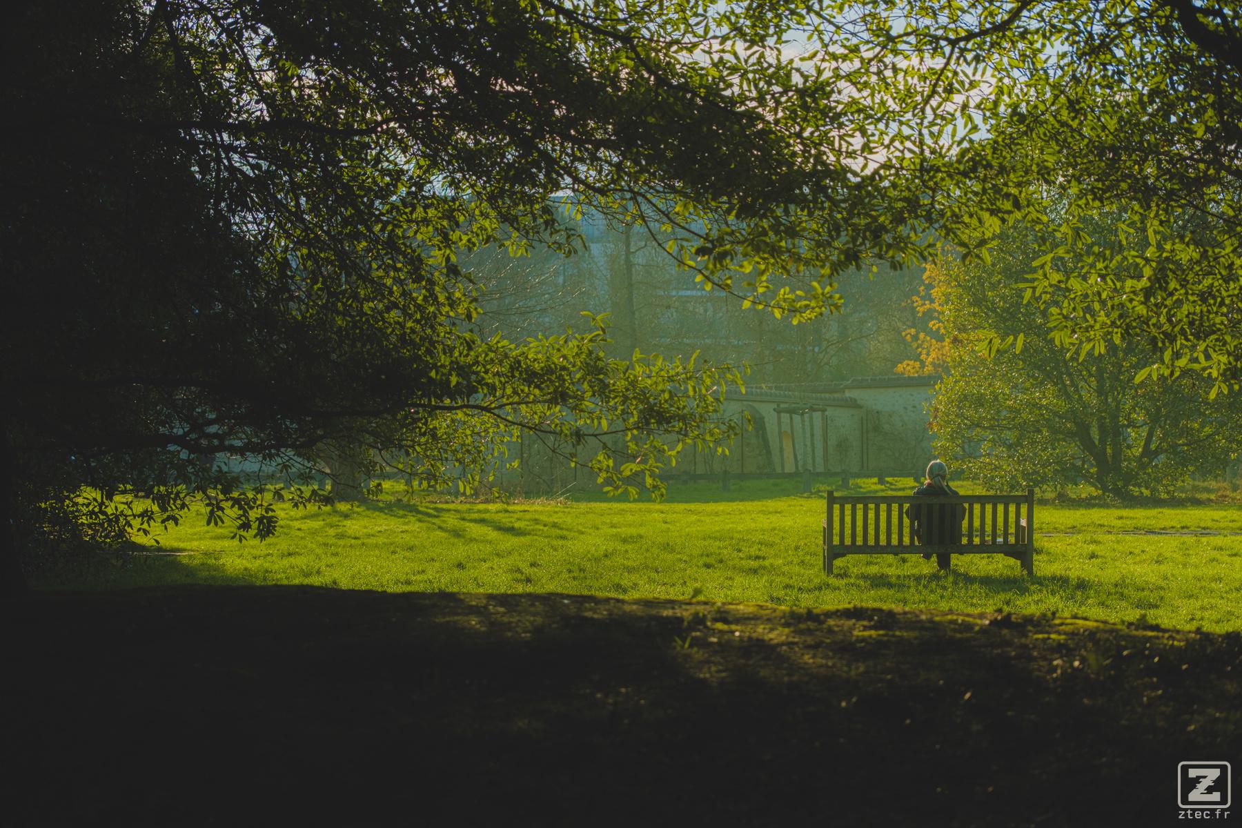 | Description | A person on a bench in a green scenery | |