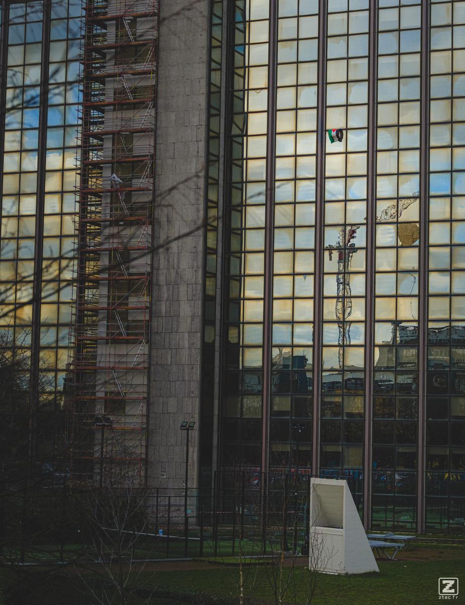 | Description | A Palestinian flag hanging of a window on a small sky scraper in from of the ULB Brussel. | |