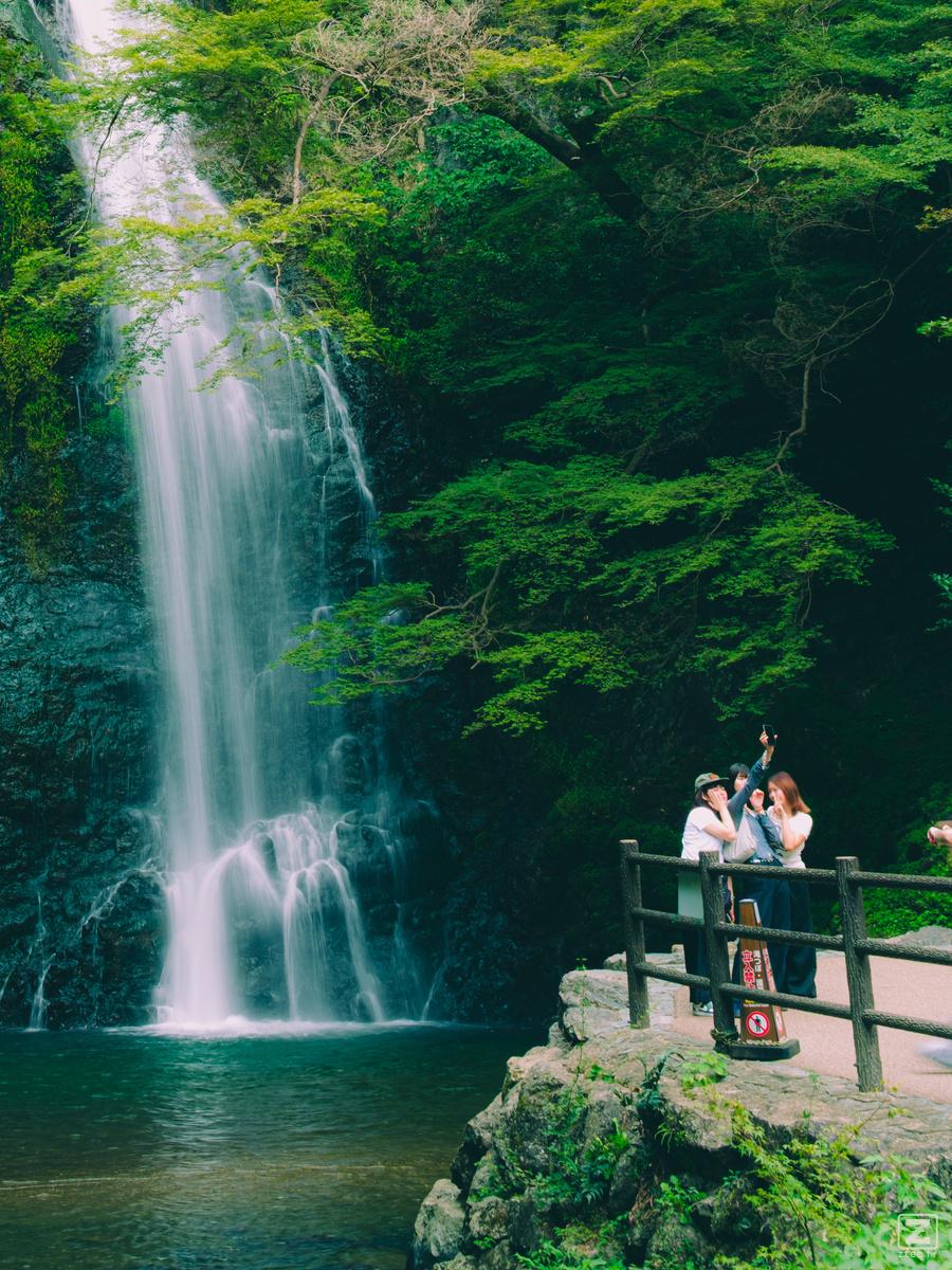 | Description | Tourists taking pictures of themselves in front of a beautiful waterfall | |